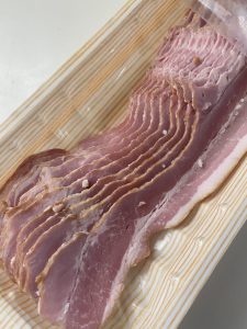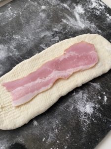 ◆パン用の麺棒を使い、横長く伸ばしてベーコンを真ん中に乗せます。